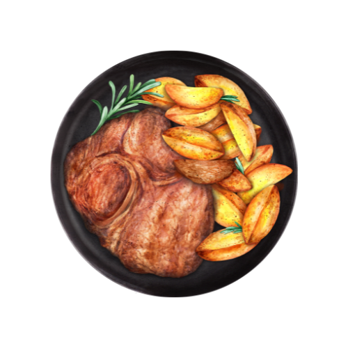 150g Steak z bravčového karé na grile, 100g smotanový kel so slaninkou, 250g pečené zemiaky v šupke (obsahuje 1,7)